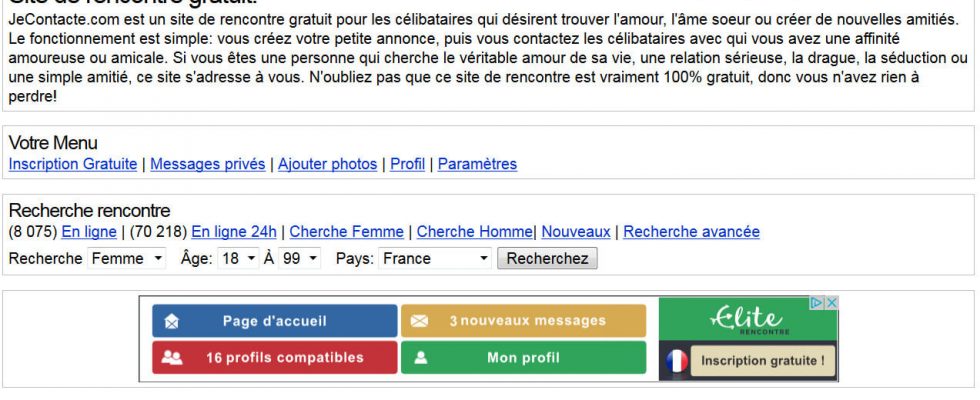 Comptant plus d’un million et demi de membres, je contacte est un site de chat et rencontre pour les célibataires qui cherchent une compagnie passagère, une relation sérieuse ou le mariage. C’est un site gratuit qui facilite les recherches de rencontres sur internet entre différentes personnes de différents départements et pays.